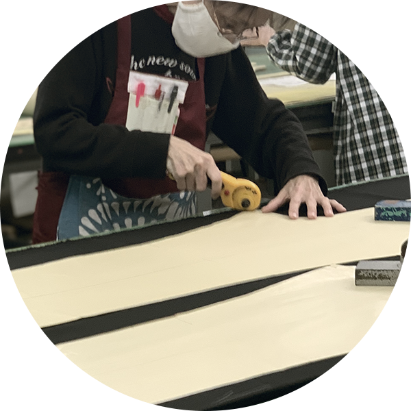 生地を手裁断しております。専用型紙を起こし手裁断する工程は、